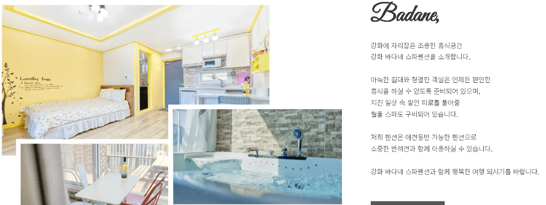 일부 객실 월풀스파,애견동반,야외 수영장 다양한 테마를 즐길 수 있는 강화 바다네 스파펜션입니다. 커플,가족과 함께 즐거운 시간 보내세요 !